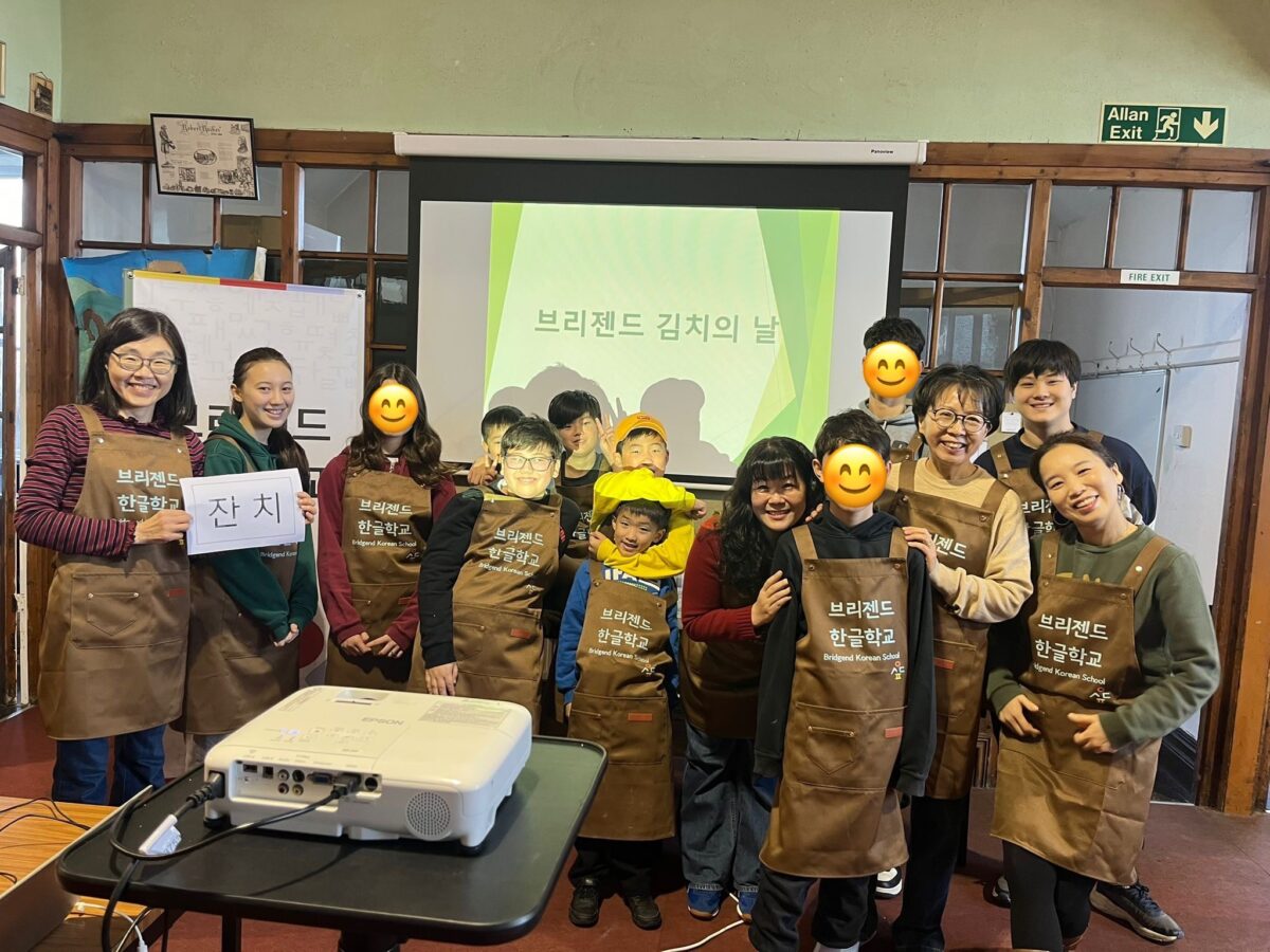 브리젠드 한글학교는 11월 29일에 김장을 했습니다. 특별히 올 해의 한글학교 김장은 더욱 고조된 분위기에서 시작되었어요. 모두가 브리젠드 한글학교 로고가 예쁘게 새겨진 앞치마를 두르고, 한국의 김치가 이제 세계적인 음식으로 떠오르고 있다는 사실을 배웠기 때문이랍니다.