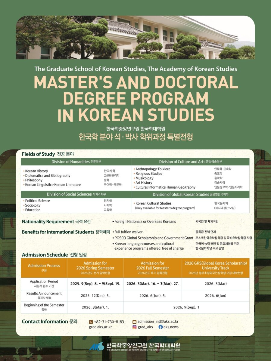 한국학 분야 석사 및 박사과정에 관심있는 외국인 및 재외국민 학생들의 많은 지원 바랍니다.