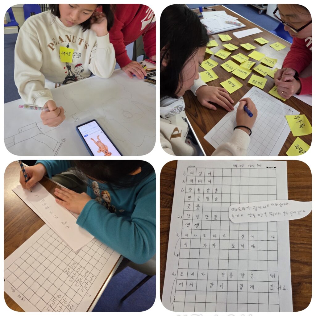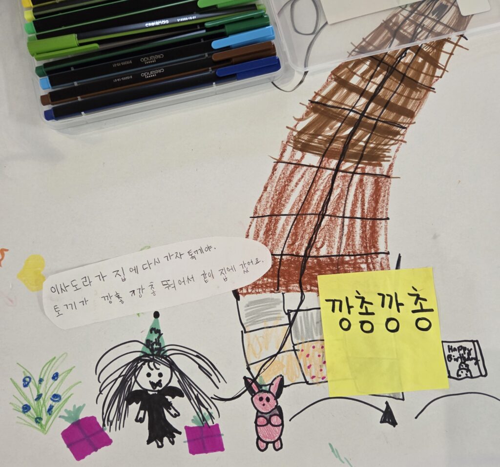 아이가 보통 한글학교다녀온후 오후시간에 만화를 보거나 영화를 보는걸 좋아하는데 지금 1시간 내내 오늘 배운 의성어 의태어 등을 이용하여 그림을 그리고 글자를 쓰면서 노래를 부른다고 하셨습니다.