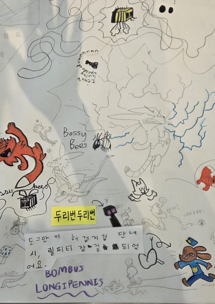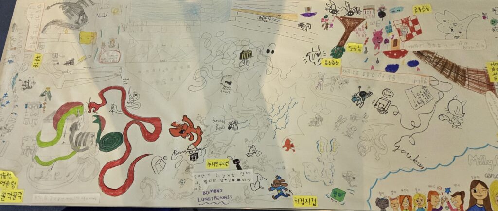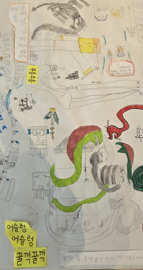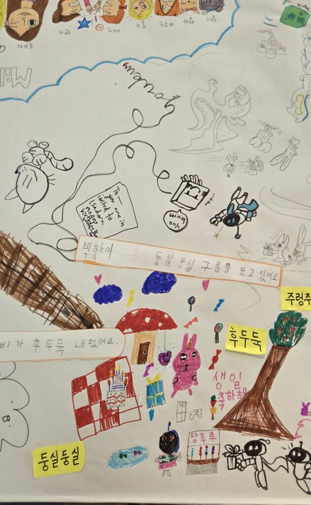 아이들이 예시로 준 의성어와 의태어를 읽고 뜻을 설명해주며 동작으로 표현하고 본인들이 원하는 “만약에” 라는 상상화의 주제를 가지고 서로 의논하게 만들고, 몸으로 표현하며 ,그림을 잘그리는 아이들은 본인의 생각과 의지대로 표현하고 그림을 그리길 어려워하는 친구들은 그림으로 표현할때는 정해진 답이 있는게 아니다. 예를 들어 토끼가 항상 하얀색이거나 코끼리가 항상 코가 길 필요는 없다 라고 예기하여 용기를 볻돋아 주어, 동작 또는소리 표현들을 배운 의성어와 의태어에 맞춰 그리면 된다라고 용기를 붇돋아 주었습니다. 중요한것은 생각하는 것을 스스로 표현할수 있도록 유도해주어 아이들이 스스로 표현하고, 거기에 맞춰 한글로 문장을 써 내는것이라고 알려주었습니다. 3시간의 긴 시간동안 아이들은 서로 웃고 떠들며 쉬는시간도 잊은체 모두 몰두해 주었고 그런 아이들을 바라보니 아.. 이수업을 하기를 잘했구나 라는 뿌듯함도 느껴젔습니다. 이것도 하나의 한글수업인데 아이들은 마치 자기들이 편하게 노는것처럼, 마치 수업이 수업이 아니것처럼 느껴졌는지, 많이 웃고 떠들고… 참으로 사랑스럽지 않을수 없었습니다.