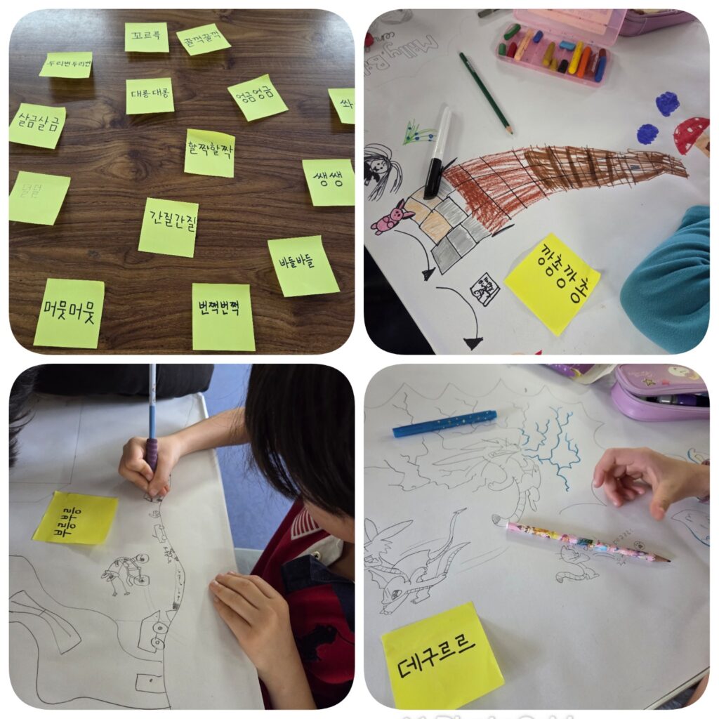 미술 주제는 “ 만약에” 라는 상상화이고, 거기에 맞추어 한글은 “의성어” 그리고 “의태어”를 이용하여 문장을 하나씩 만들도록 유도하였습니다. 보통 책 그리고 만화책를 보면 의성어와 의태어가 제법 많이 등장합니다. 우리 아이들에게 한글책을 읽어줄때 아이들이 이해하지못하는 의성어와 의태어가 많은 부분을 참고하여 만든 수업이지요.